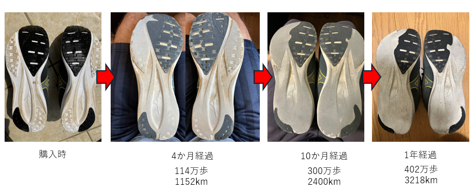このように経過を見ていくと非常に面白いですが、特に右足のつま先の部分の擦り減りが大きいようです。