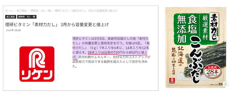 我が家で使っている理研ビタミンのこんぶだしは730円→852円、約17%の値上げです。
