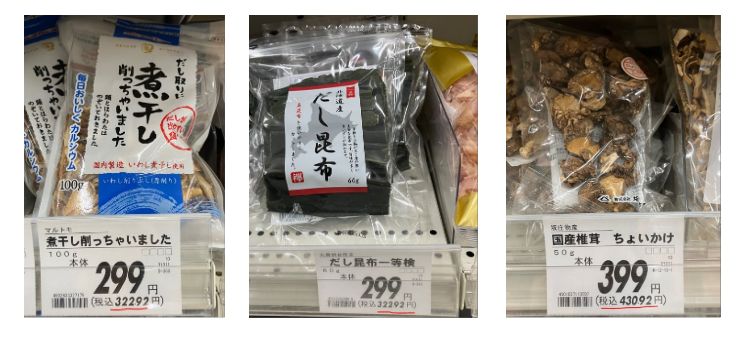 後で紹介しますが、例えば、今回紹介する煮干し100g+昆布60g+椎茸50gの計210gで粉末を作った場合、店頭価格は税込みで煮干し323円、昆布323円、椎茸431円の合計1077円です。