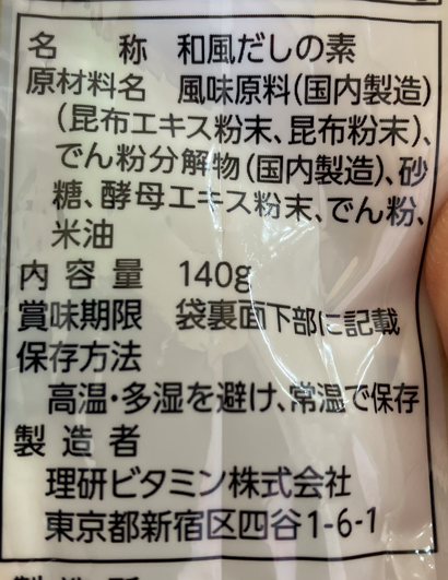 例えば、我が家で使っている理研ビタミンの無添加の粉末だしですが、以下が含有物としてが入っています。