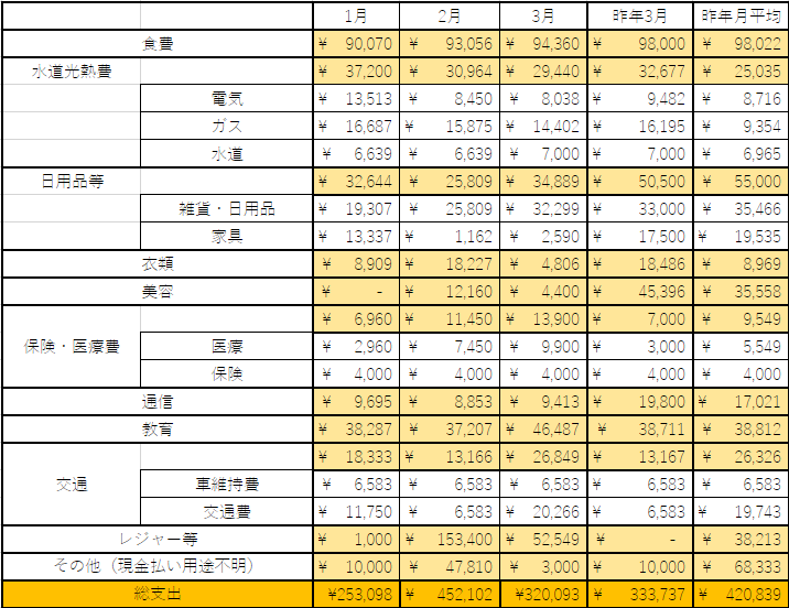 総支出は約32万で、昨年3月より若干少なくなっているという微妙~な結果になりました。😅
