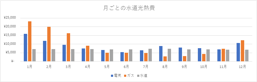 もう少し詳細をみるために水道光熱費の月間の請求額を月ごとにまとめてみました。
