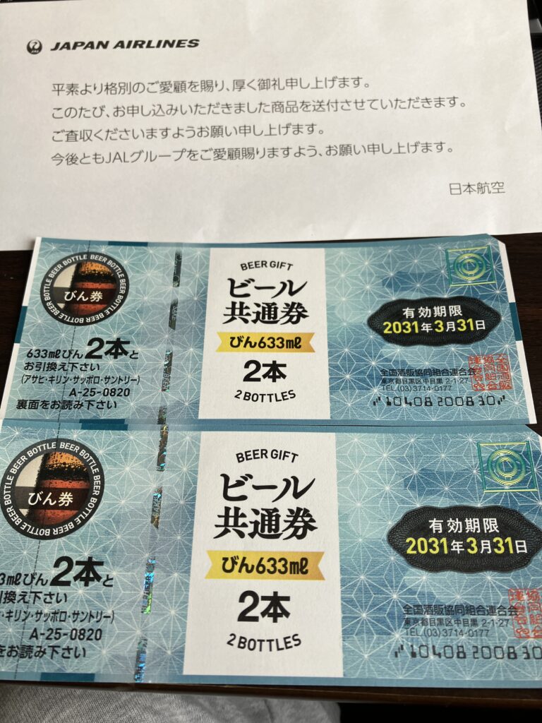 私の場合はほとんど中国の出張だと思うんですが、気づいたら6000マイル以上貯まっていたので、瓶ビール共通券4枚(6000マイル分)と交換しました。