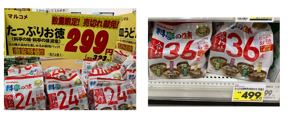左が特売で売ってたインスタント味噌汁24食分で299円。右がいつも買っている同じメーカーのインスタント味噌汁36食分で499円。