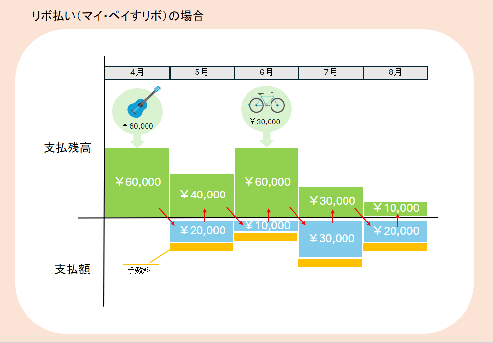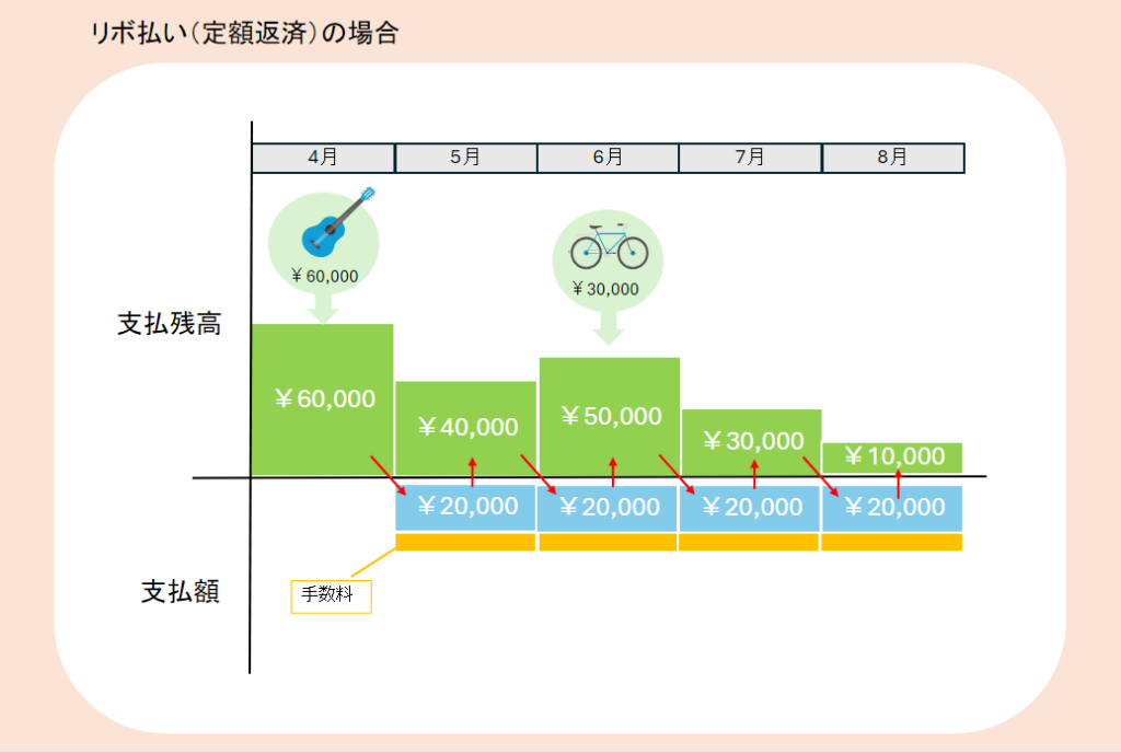 例えば、毎月¥20,000を定額返済に設定していたとすると、¥60,000のギターを購入しようが¥30,000の自転車を購入しようが、月々の支払額は¥20,000で定額になります。(元金定額)