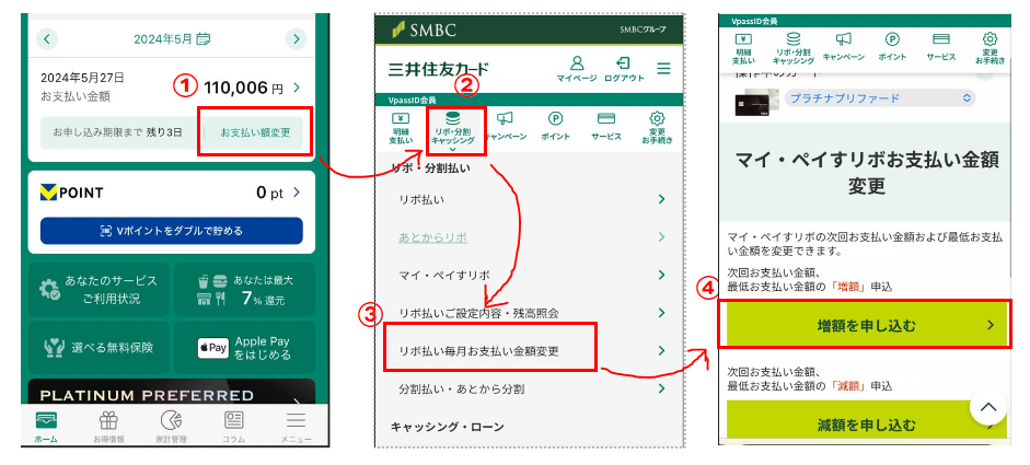 ①:スマホからVpassを起動し「お支払い額変更」をタップ