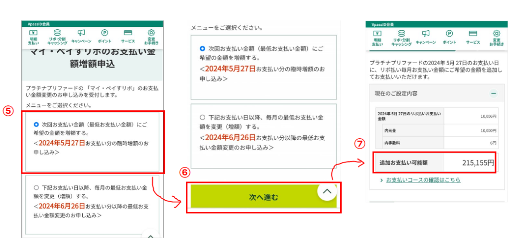 ⑤:マイ・ペイすリボのお支払い金額増額申込で、「次回お支払い金額(最低お支払い金額)にご希望の金額を増額する。」を選択