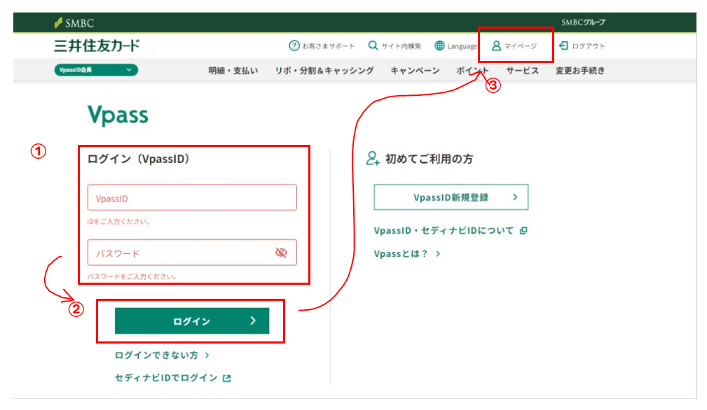 ①~③:三井住友カードのVpassのWebサービスにログインし、マイページを開きます。