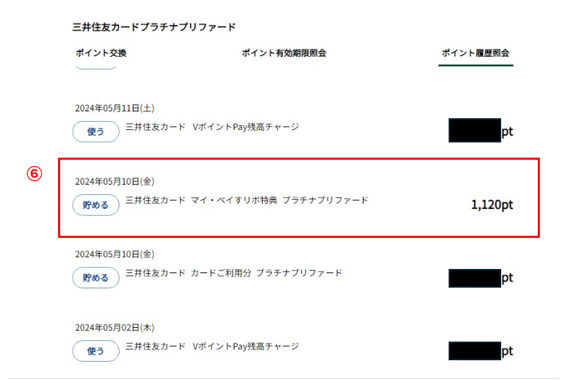 ⑥:出てきたポイント履歴のなかの「マイ・ペイすリボ特典」が0.5%UP分になります