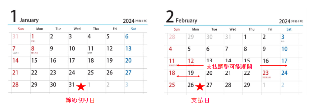 例えば、「一括払い」で月末締めの翌月払いの場合は下のようになります。