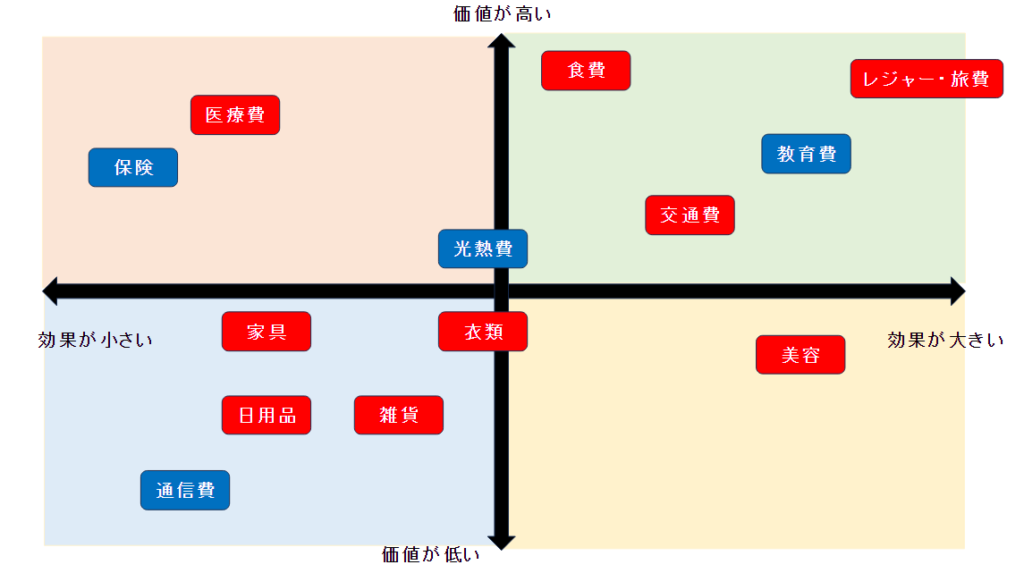価値が高く、効果も大きい領域(緑)は節約の行動へ移す前に、節約するのか否か、節約するならばどこまで手を付けるのかというのをよく話し合った方がよいのではないかと思いますね。