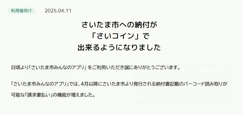 2025年4月11日に、この税金の支払い方法について【さいたま市みんなのアプリ】の公式HPから下記のようなアナウンスがありました😮😮