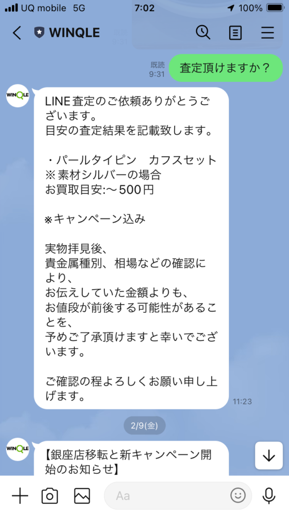 LINE登録して画像を送ると査定の結果を返信してくれる。便利ですね~。