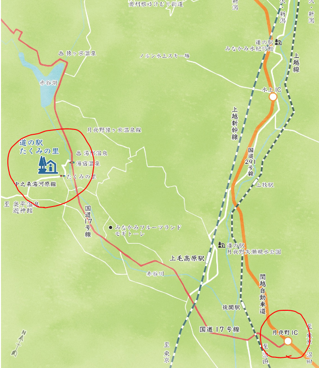 「たくみの里」は月夜野ICから車で15分ぐらいです。猿ヶ京温泉や苗場スキー場へ向かう途中にあります。